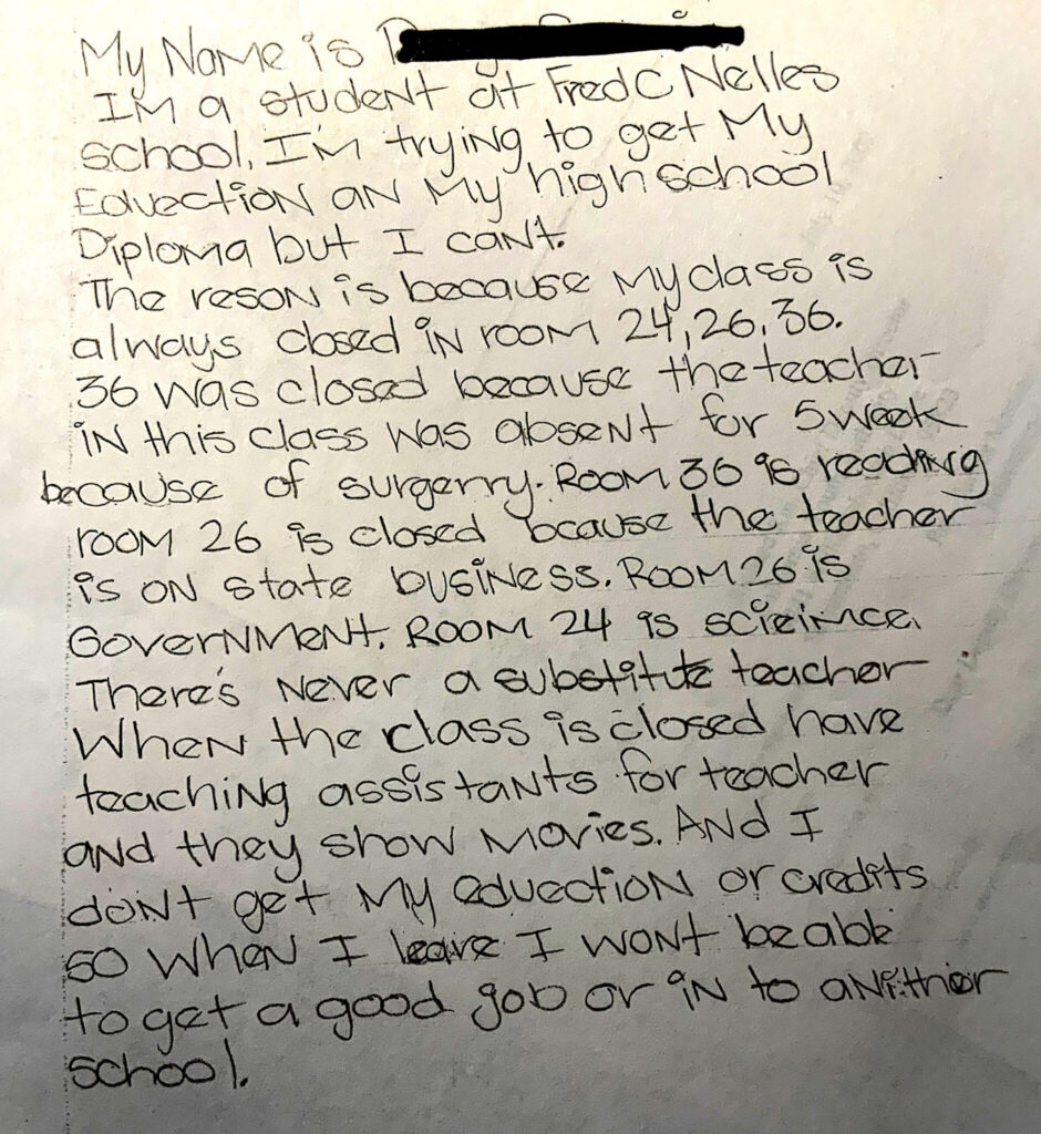 “I continue to see the same stuff happen with no change but only for the worst,” one teenager wrote. “We need our rights protected and the only way is through some outside help and through the court system.”