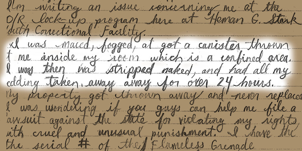 One letter-writer described having a chemical grenade thrown at him inside a poorly-ventilated cell, then being stripped naked and left to sit in the noxious fumes. Even in that state, he managed to jot down the serial number and full title on the canister — “Flameless Grenade/ Chemical Irritating Agent” — “so they can’t say I made it up.”