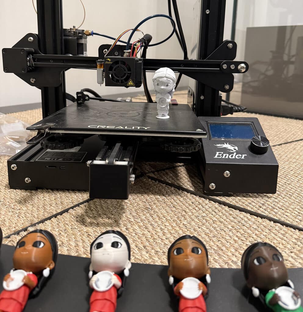 There are 10 different 3D-printed toy options for a care package, inspired by O’odham culture: like a rattle, gourd, cradle board, or a toy of a Native boy holding a bow and arrow. Female foster children’s care packages get a toy of a Native girl in traditional regalia. The toys are plain white and can be painted any colors the child chooses.