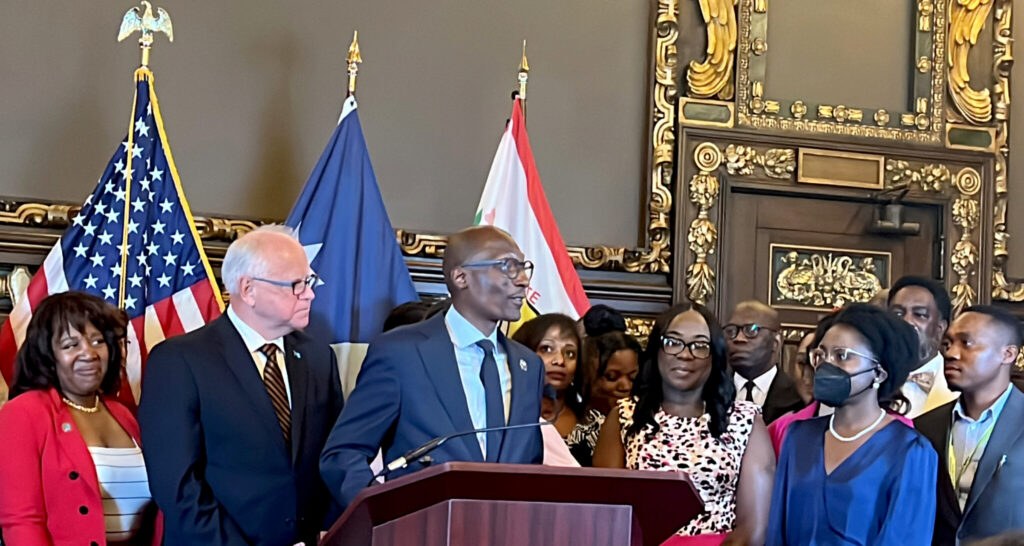 Gov. Tim Walz signed the bill today surrounded by a leading advocate for the legislation, Kelis Houston, head of the nonprofit family-serving Village Arms organization; Tikki Brown, commissioner of the state’s newly created Department of Children, Youth and Families and state lawmakers who have pushed for the bill over the many years it has been attempted before passing the Legislature in May. They included Reps. Esther Agbaje, María Isa Pérez-Vega and Rena Moran, and Sen. Bobby Joe Champion.