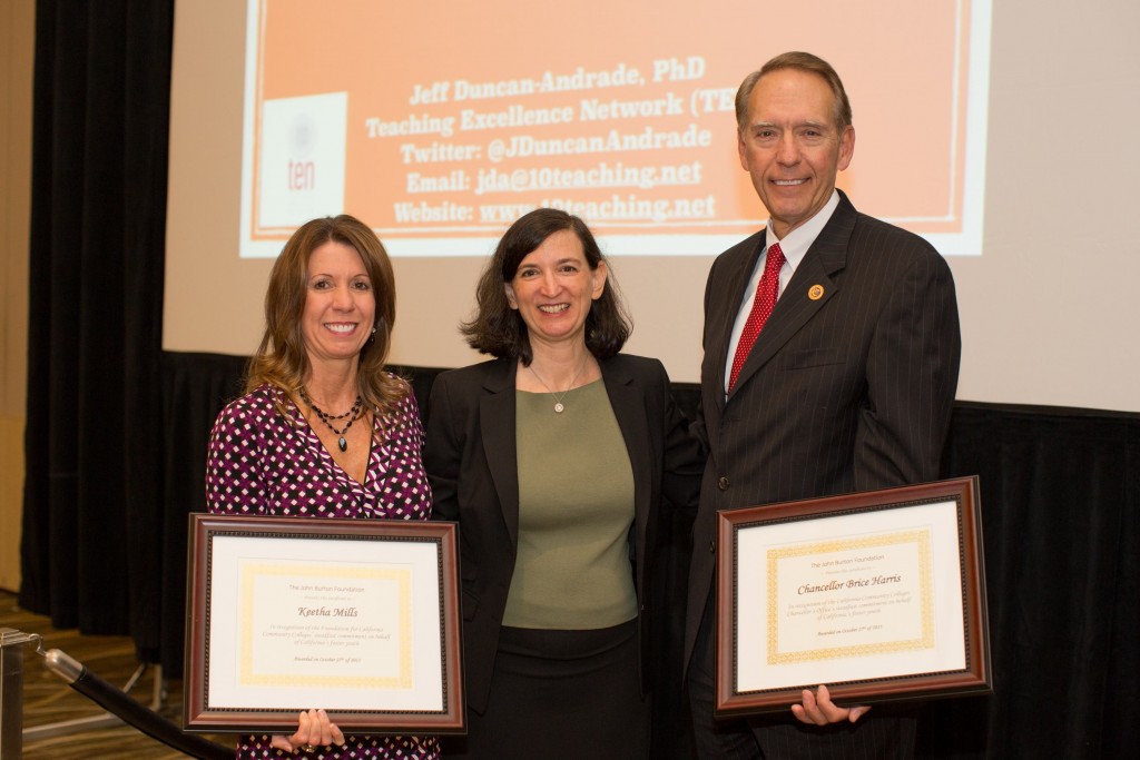 During a packed conference luncheon in Los Angeles on Tuesday, California Community College Chancellor Brice Harris accepted an award from a consortium of foundations, advocacy groups and college-based service centers for foster youth.