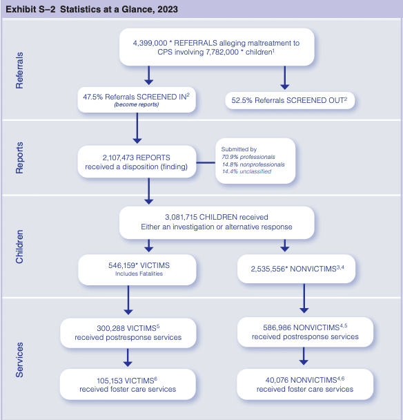 Child Maltreatment 2023 finds that there were nearly 4.4 million referrals to child protective services in fiscal 2023, a 3% increase from the previous year. Just over three million of those children were involved in either CPS investigations or alternative response services, essentially the same amount as last year.