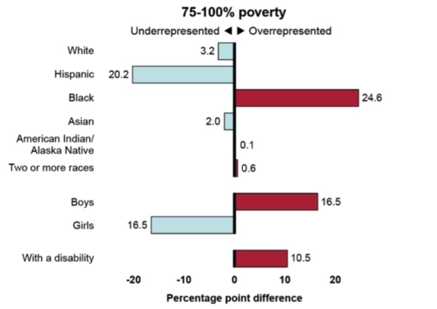 - Black students: Overrepresented by 24.6 percent