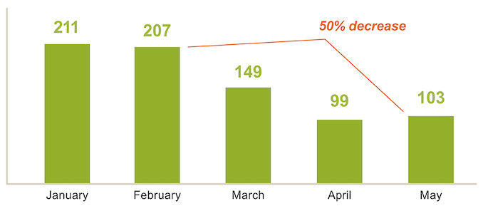 April: The decline in admissions reached 52%, but the average daily population only dropped by 32% because the release rate had slowed to pre-coronavirus levels. Click here to read more.